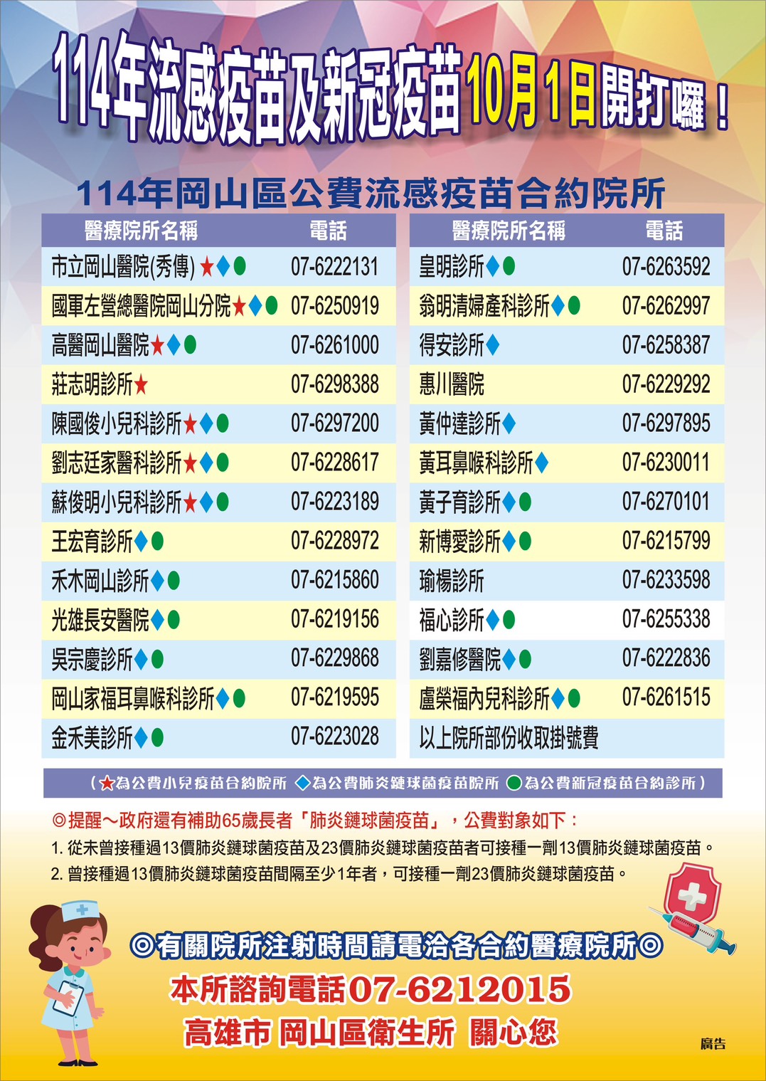 以下提供岡山區流感疫苗合約院所資料及社區接種站資料,請符合流感、新冠疫苗公費接種對象,10/1起可持健保卡至合約院所或社區接種站完成疫苗接種唷!